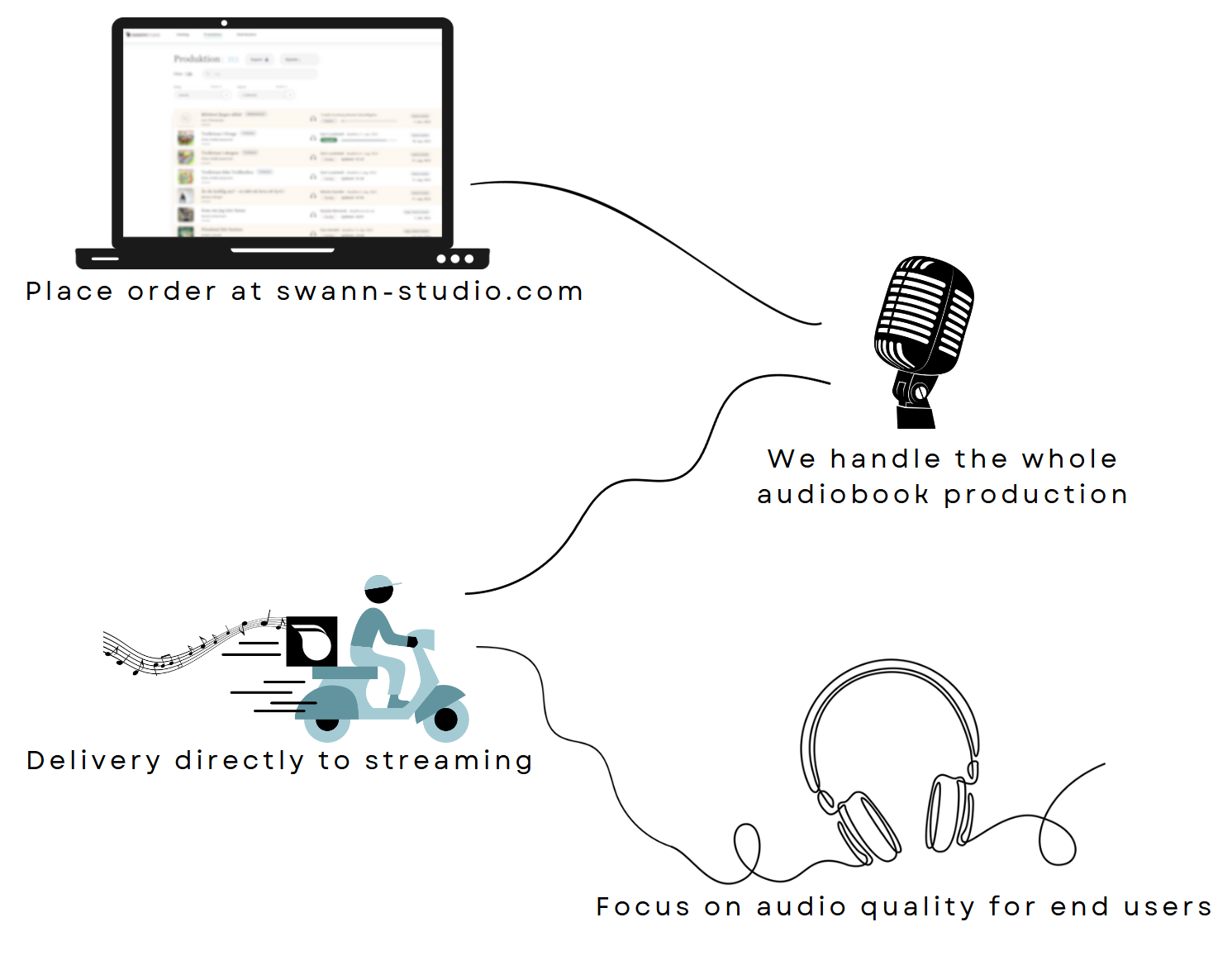 At Swann Studio, our expertise lies in delivering great audiobooks, focusing on the collaboration with our customers, narrators and audio engineers. We understand that as your publishing house grows and your audiobook portfolio expands, maintaining a great collaboration in dealing with the growing calatogue becomes crucial. Our team of Audiobook Producers and Audio Engineers are used to handling multiple projects simultaneously, with a goal of delivering a great listening experience each time, expected by our customers. We do the audiobook project management easy for you!